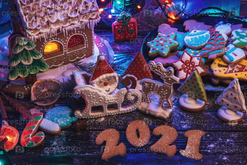 Пряники на новый год и рождество на деревянном фоне, рождественская тема