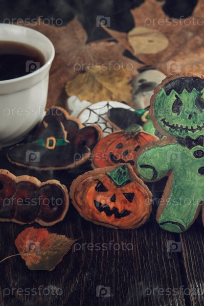 Имбирное печенье на праздник Хэллоуин на деревянном столе с местом для копирования