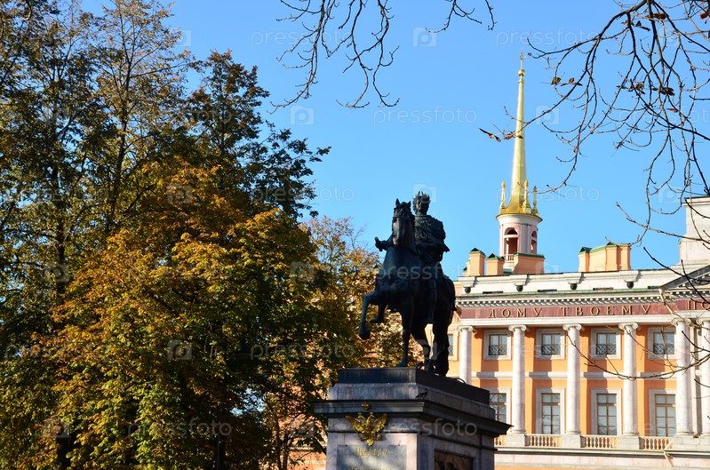 Памятник императору Петру I у инженерного (Михайловского) замка в Санкт-Петербурге осенью