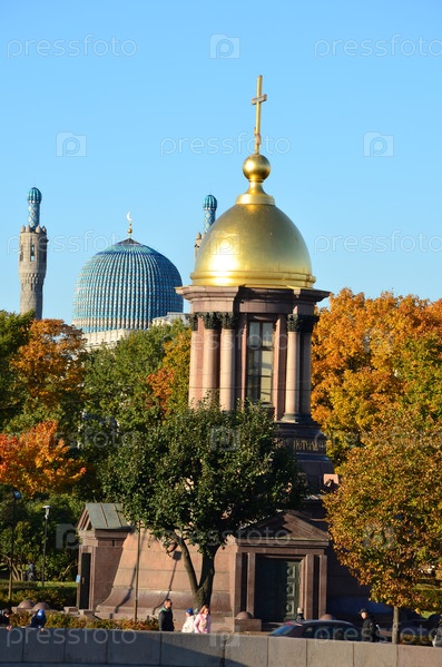 Соборная мечеть и Церковь-часовня Троицы Живоначальной – православный храм на Троицкой площади в Санкт-Петербурге в осенний день