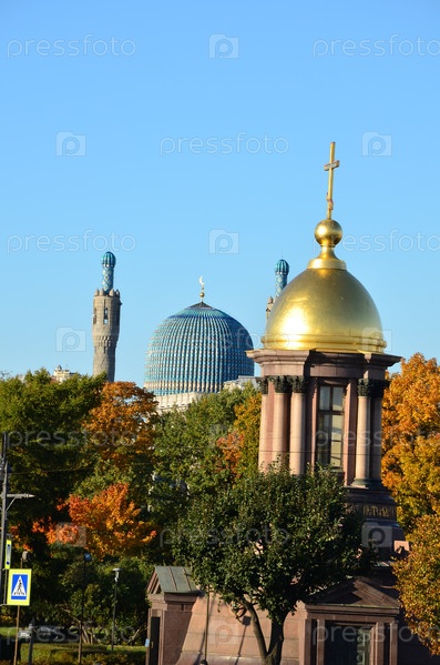 Соборная мечеть и Церковь-часовня Троицы Живоначальной – православный храм на Троицкой площади в Санкт-Петербурге в осенний день
