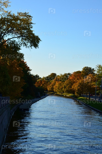 Осенний вид на реку Карповка в Санкт-Петербурге: понтон, разноцветные деревья