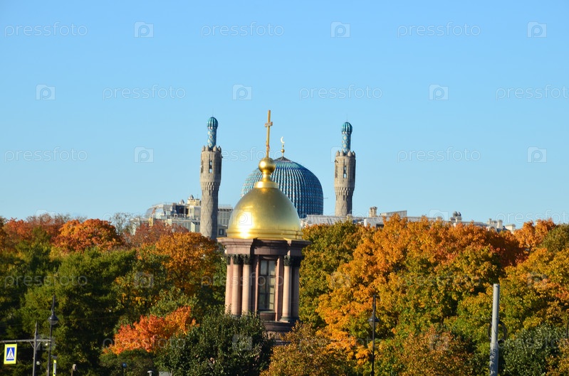 Соборная мечеть и Церковь-часовня Троицы Живоначальной – православный храм на Троицкой площади в Санкт-Петербурге в осенний день
