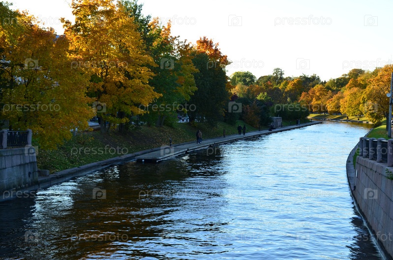 Осенний вид на реку Карповка в Санкт-Петербурге: понтон, разноцветные деревья