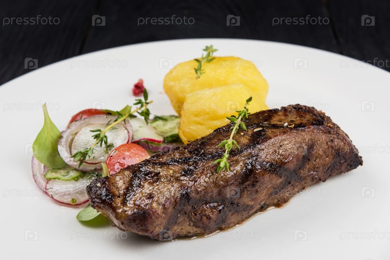 Жареное мясо говядины с картофелем и овощами на белой тарелке