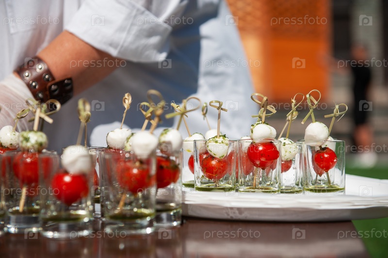 Концепция питания: Разнообразные закуски на столе, банкет на открытом воздухе