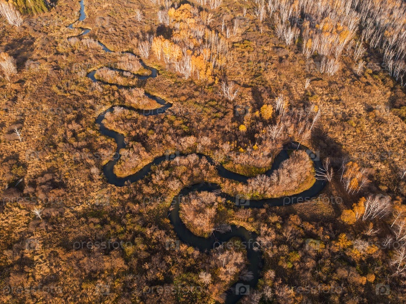 Вид с воздуха с беспилотника на осенний пейзаж с рекой