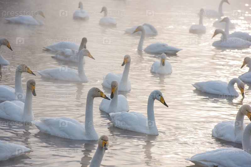 Красивые белые лебеди-кликуны плавают в незамерзающем зимнем озере. Место зимовки лебедей, Алтай, Сибирь, Россия