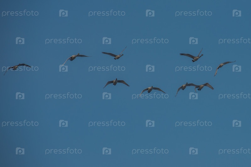 Летящие белые лебеди-кликуны, Алтай, Сибирь, Россия