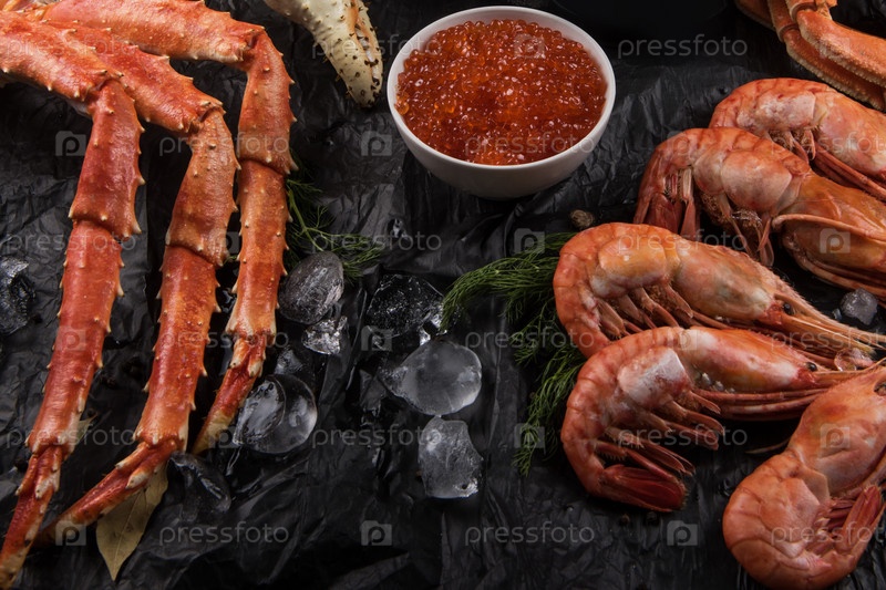 Набор морепродуктов: красная и черная икра, конечность волосатого краба, конечность краба-стригуна, дальневосточный камчатский краб