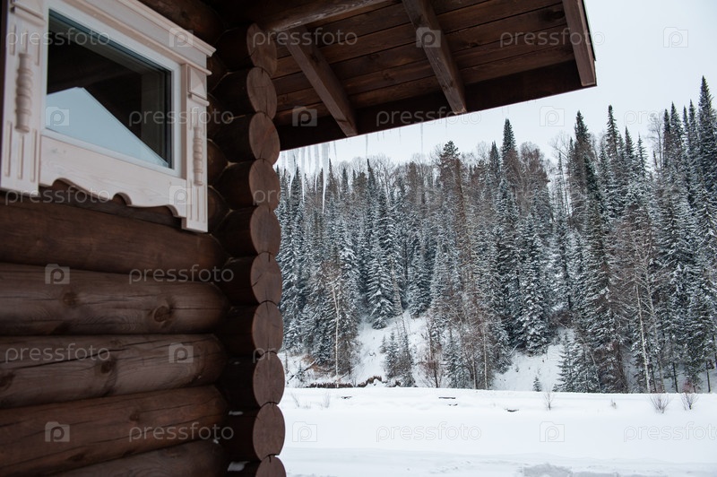 Зимний дом в лесу. Чистый воздух, отдых и релаксация. Единение с природой. Вид с крыльца на лес