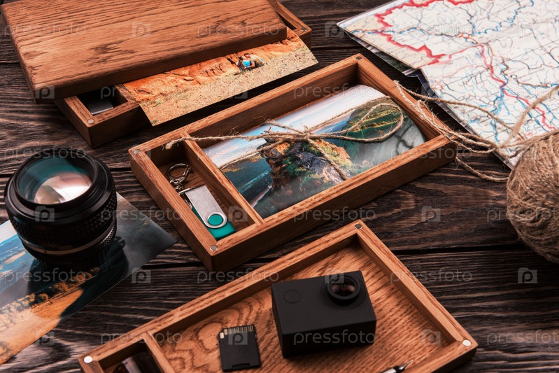 Деревянная фотокоробка с фото из путешествия. Украшена разными вещами. Концепция путешествия