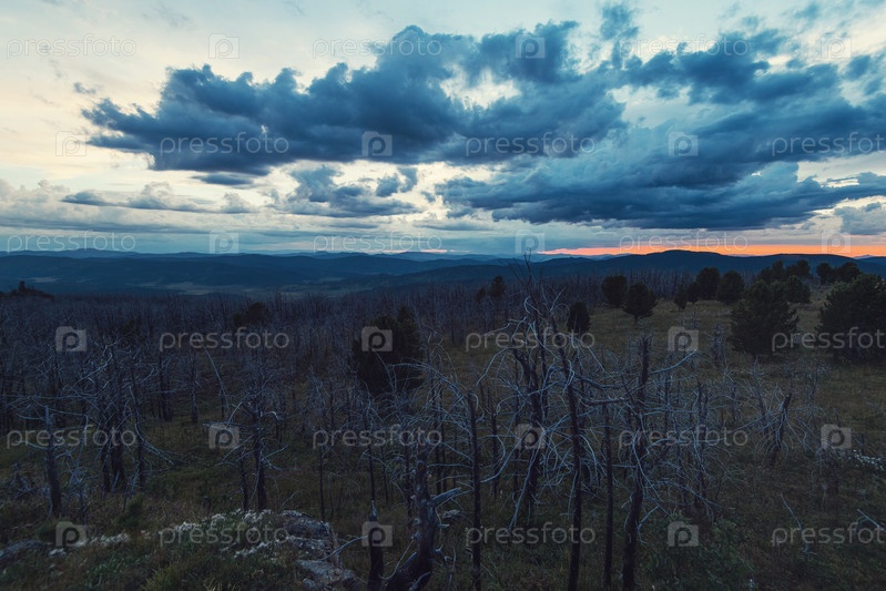 Пейзаж с мертвым лесом на перевале, высота более 2000 метров, в горах Алтая