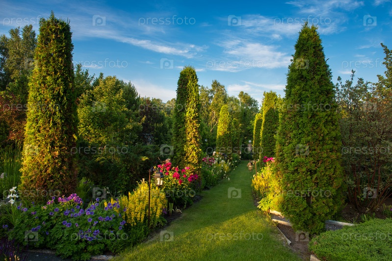 Красивые цветы и деревья пейзаж в ботаническом саду в красоте летнего вечера. Горизонтальная ориентация