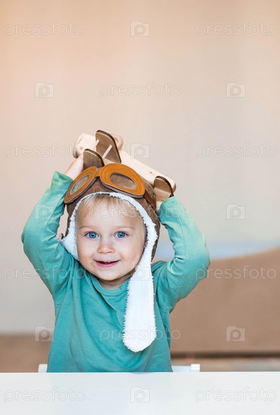 Симпатичный мальчик 2 лет в пилотской шапке играет с деревянным самолетом и конструктором логистики. Детские деревянные игрушки для развития ребенка