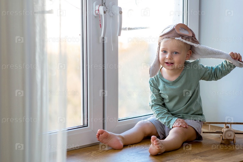 Милый 2-летний мальчик в кепке играет на подоконнике с деревянным самолетиком. Детские деревянные игрушки для развития ребенка