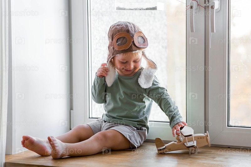 Милый 2-летний мальчик в кепке играет на подоконнике с деревянным самолетиком. Детские деревянные игрушки для развития ребенка