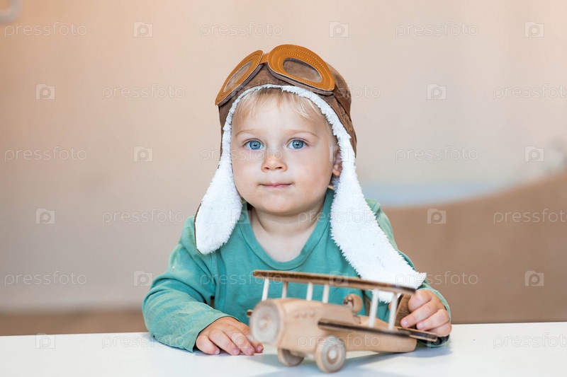 Симпатичный мальчик 2 лет в пилотской шапке играет с деревянным самолетом и конструктором логистики. Детские деревянные игрушки для развития ребенка