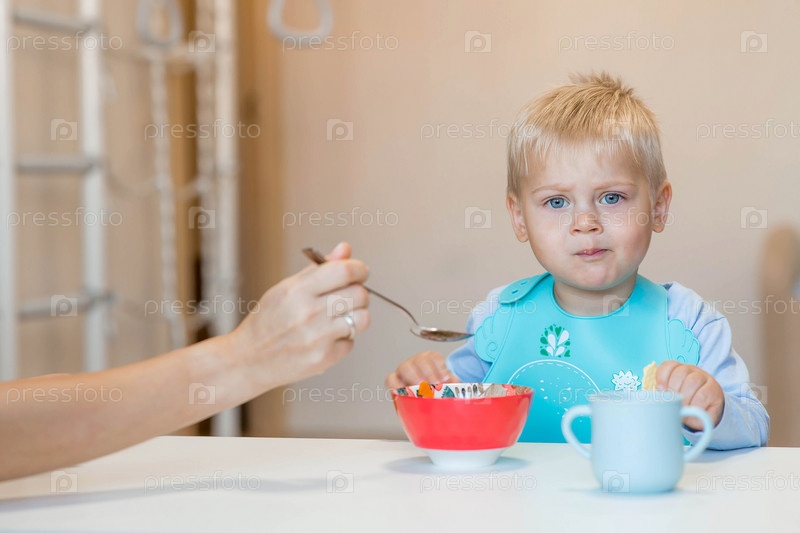 Детское питание. Первый прием пищи. Кормление ребенка. Мама кормит ребенка с ложечки. Здоровое питание