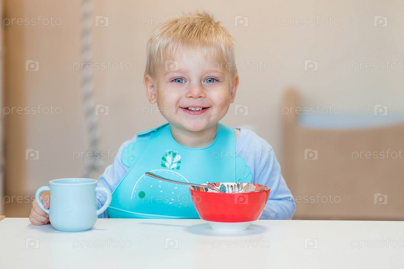 Детское питание. Еда. Кормление ребенка. Милый ребенок ест сам ложкой. Здоровое питание. Семья и дети