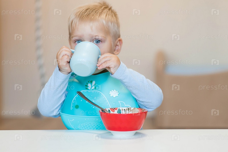 Детское питание. Первый прием пищи. Кормление ребенка. Малыш пьет из синей кружки. Баланс питья