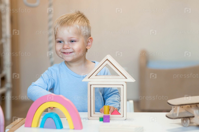 Мальчик 2 лет играет в развивающий конструктор логистика. Детские деревянные игрушки. Монтессори для развития ребенка