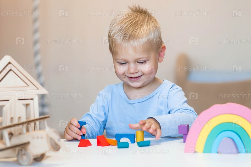 Мальчик 2 лет играет в развивающий конструктор логистика. Детские деревянные игрушки. Монтессори для развития ребенка