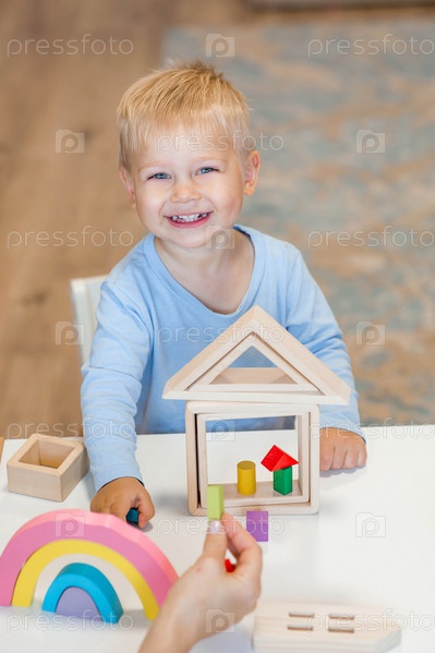 Мальчик 2 лет играет в развивающий конструктор логистика. Детские деревянные игрушки. Монтессори для развития ребенка