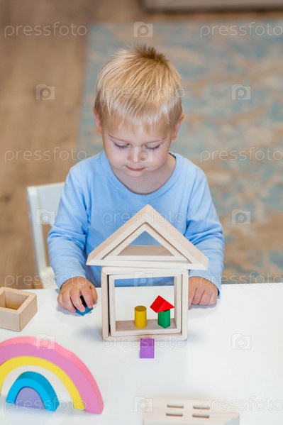 Мальчик 2 лет играет в развивающий конструктор логистика. Детские деревянные игрушки. Монтессори для развития ребенка