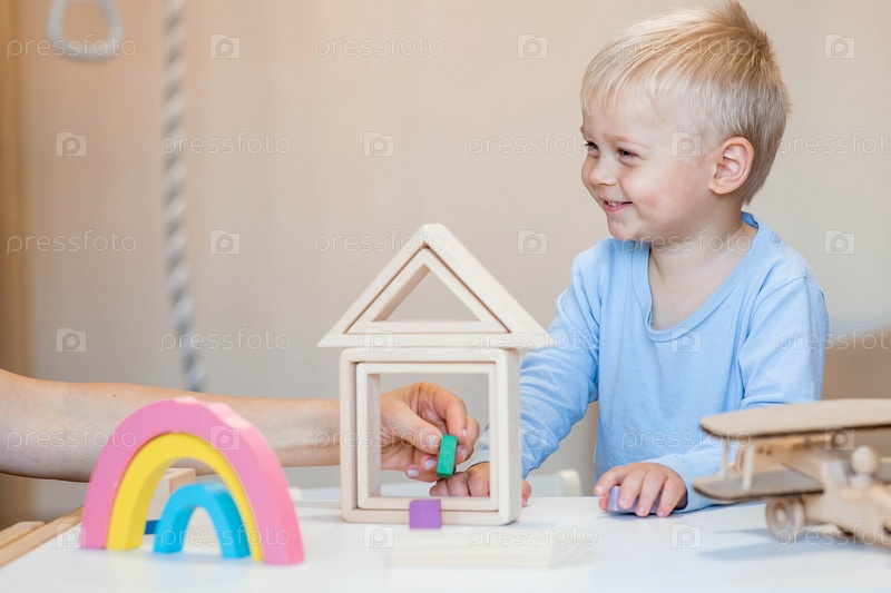 Мальчик 2 лет играет в развивающий конструктор логистика. Детские деревянные игрушки. Монтессори для развития ребенка