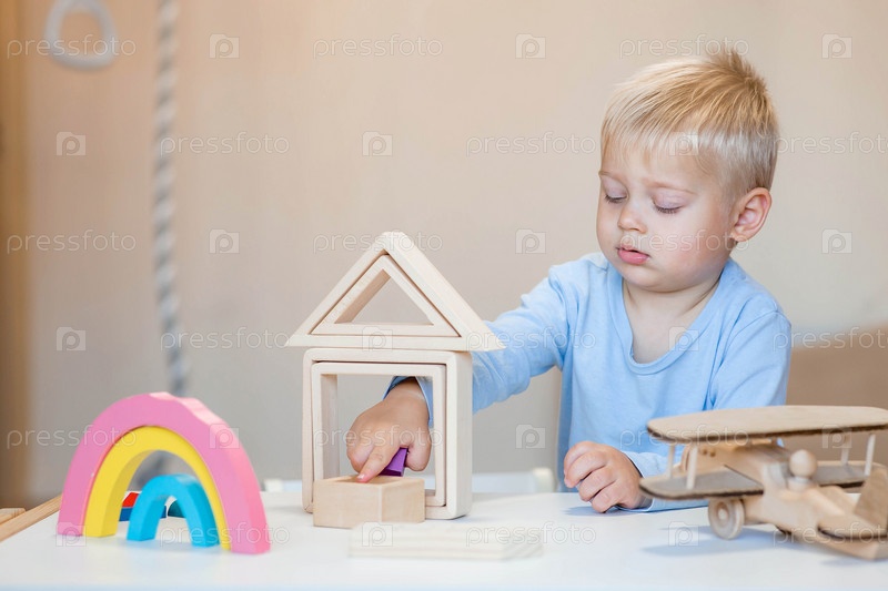 Мальчик 2 лет играет в развивающий конструктор логистика. Детские деревянные игрушки. Монтессори для развития ребенка