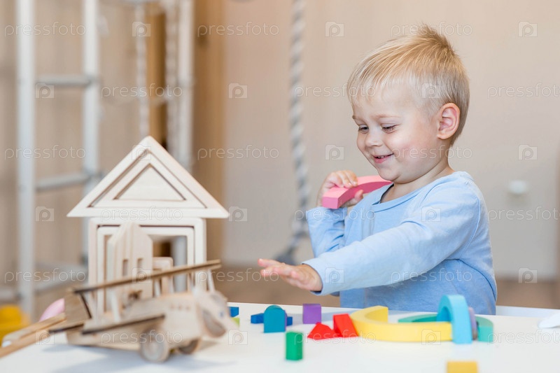 Мальчик 2 лет играет в развивающий конструктор логистика. Детские деревянные игрушки. Монтессори для развития ребенка