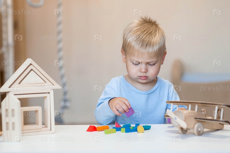 Мальчик 2 лет играет в развивающий конструктор логистика. Детские деревянные игрушки. Монтессори для развития ребенка