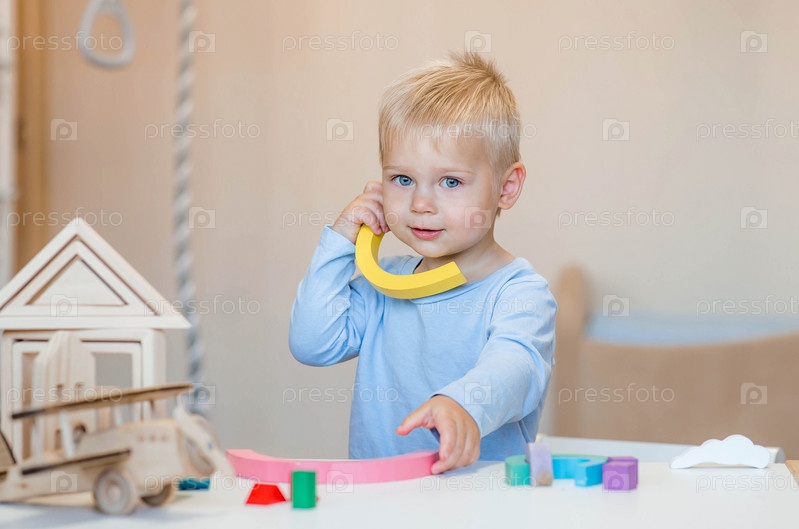 Мальчик 2 лет играет в развивающий конструктор логистика. Детские деревянные игрушки. Монтессори для развития ребенка
