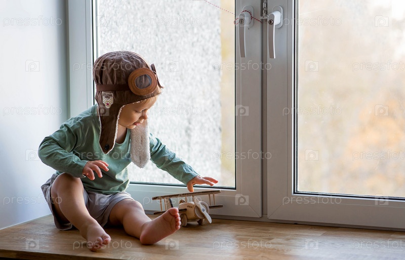 Милый 2-летний мальчик в кепке играет на подоконнике с деревянным самолетиком. Детские деревянные игрушки для развития ребенка