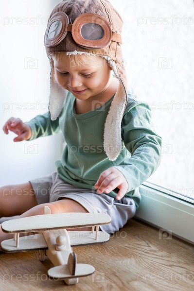 Милый 2-летний мальчик в кепке играет на подоконнике с деревянным самолетиком. Детские деревянные игрушки для развития ребенка