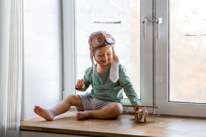 Милый 2-летний мальчик в кепке играет на подоконнике с деревянным самолетиком. Детские деревянные игрушки для развития ребенка