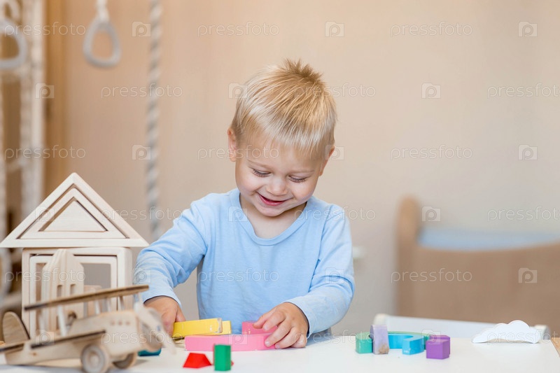 Мальчик 2 лет играет в развивающий конструктор логистика. Детские деревянные игрушки. Монтессори для развития ребенка