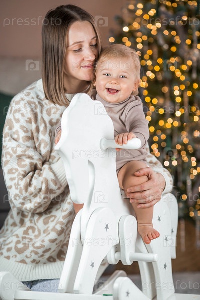 Семья. Красивый белокурый мальчик 1 года сидит на лошади с мамой на фоне рождественской елки. Концепция празднования Рождества и Нового года