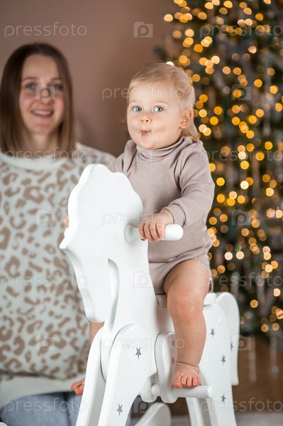 Семья. Красивый белокурый мальчик 1 года сидит на лошади с мамой на фоне рождественской елки. Концепция празднования Рождества и Нового года