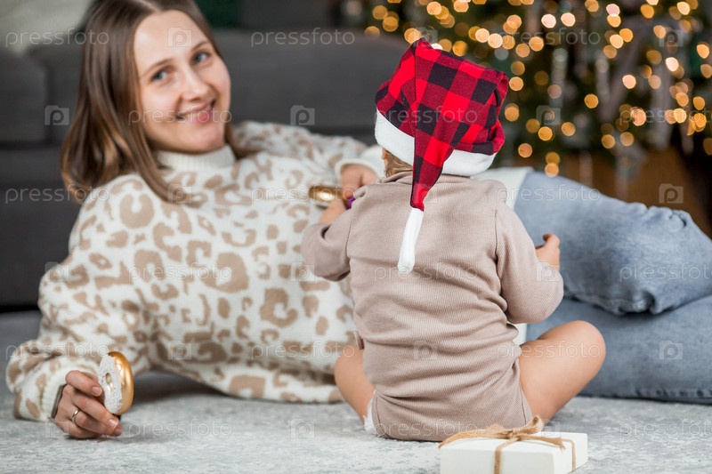 Красивый маленький светловолосый мальчик 1 года сидит с мамой на фоне рождественской елки. Концепция празднования Рождества и Нового года