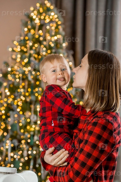 Семья. Красивый маленький светловолосый мальчик 1 года сидит с мамой на фоне рождественской елки. Концепция празднования Рождества и Нового года