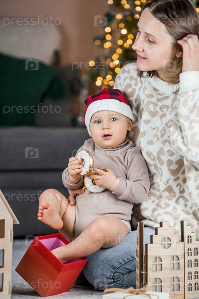 Красивый маленький светловолосый мальчик 1 года сидит с мамой на фоне рождественской елки. Концепция празднования Рождества и Нового года