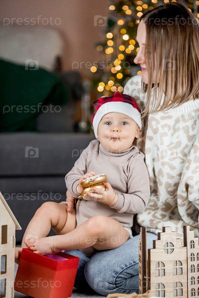 Красивый маленький светловолосый мальчик 1 года сидит с мамой на фоне рождественской елки. Концепция празднования Рождества и Нового года