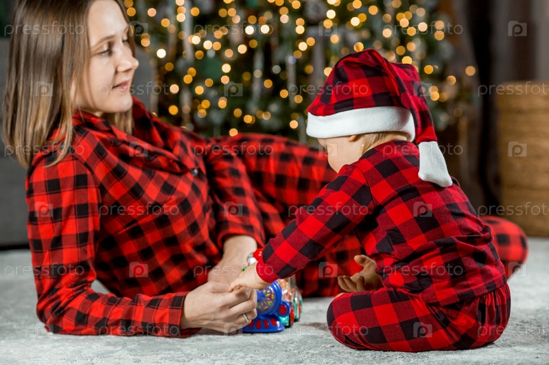 Семья. Красивый маленький светловолосый мальчик 1 года сидит с мамой на фоне рождественской елки. Концепция празднования Рождества и Нового года