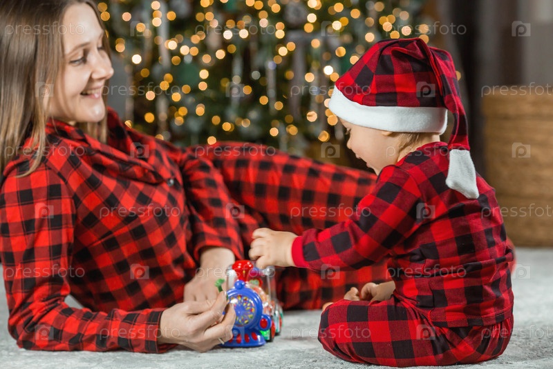 Семья. Красивый маленький светловолосый мальчик 1 года сидит с мамой на фоне рождественской елки. Концепция празднования Рождества и Нового года