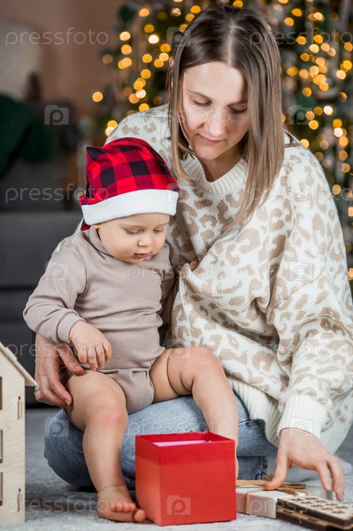 Красивый маленький светловолосый мальчик 1 года сидит с мамой на фоне рождественской елки. Концепция празднования Рождества и Нового года