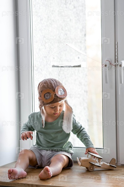 Милый 2-летний мальчик в кепке играет на подоконнике с деревянным самолетиком. Детские деревянные игрушки для развития ребенка