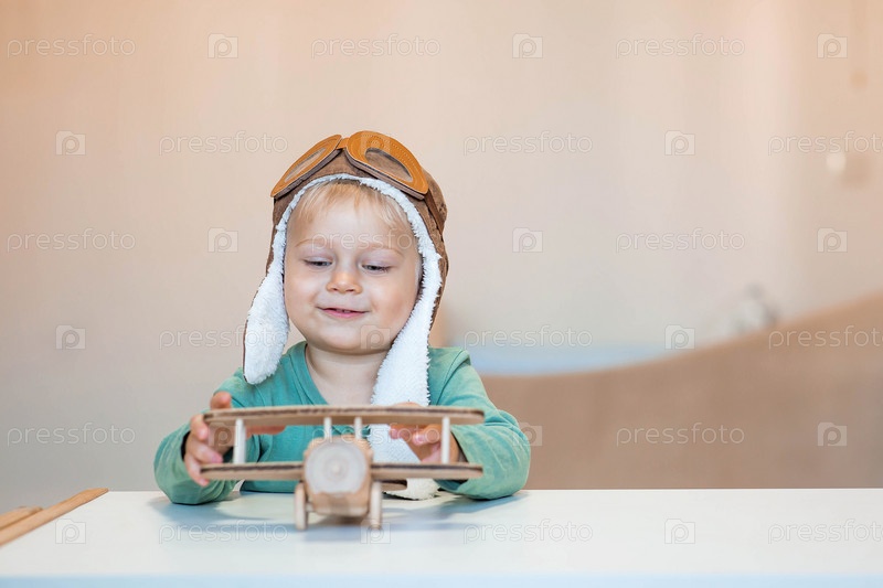 Симпатичный мальчик 2 лет в пилотской шапке играет с деревянным самолетом и конструктором логистики. Детские деревянные игрушки для развития ребенка
