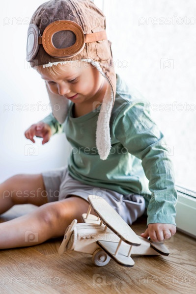 Милый 2-летний мальчик в кепке играет на подоконнике с деревянным самолетиком. Детские деревянные игрушки для развития ребенка